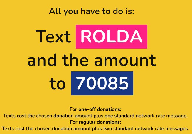 Single donation: Text ROLDA 5 to 70085 to donate £5 (or a different amount to donate as much as you wish!) Text costs £5 plus one standard rate message and you’ll be opting in to hear more about our work and fundraising via telephone and SMS. If you’d like to give £5 but do not wish to receive marketing communications, text ROLDANOINFO 5 to 70085.